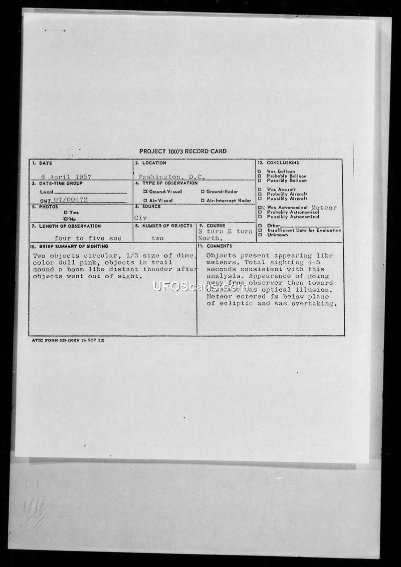 On 7 April 1957, at 0047Z, an observer located at 1121 8th Street, N.W., Washington, D.C., reported sighting two circular, dull pink objects. The observer, a 39-year-old electronics installations and repairman at Bolling Air Force Base, described the objects as being approximately one-third the size of a dime and moving in a trail formation. The objects were initially observed at an altitude of 45 degrees above the horizon, moving in a southerly direction. The observer reported that the objects turned east and then north, with an estimated speed 15 times that of a jet aircraft. The sighting lasted four to five seconds, and the observer noted a sound resembling distant thunder after the objects disappeared from sight. The weather conditions at the time were reported as broken to scattered clouds at 6500 feet with 15 miles visibility. The official conclusion reached by the Air Intelligence Information Report, prepared by Major James E. Geertz, was that the objects were meteors. The report suggests that the perceived maneuvers and the speed were optical illusions. Regarding the reported sound, the investigator noted that the thunder-like boom was likely caused by jet interceptors penetrating the sonic barrier, rather than the objects themselves. The report explicitly states that the reliability of the observer's account is unknown and that the individual was not seeking personal notoriety.