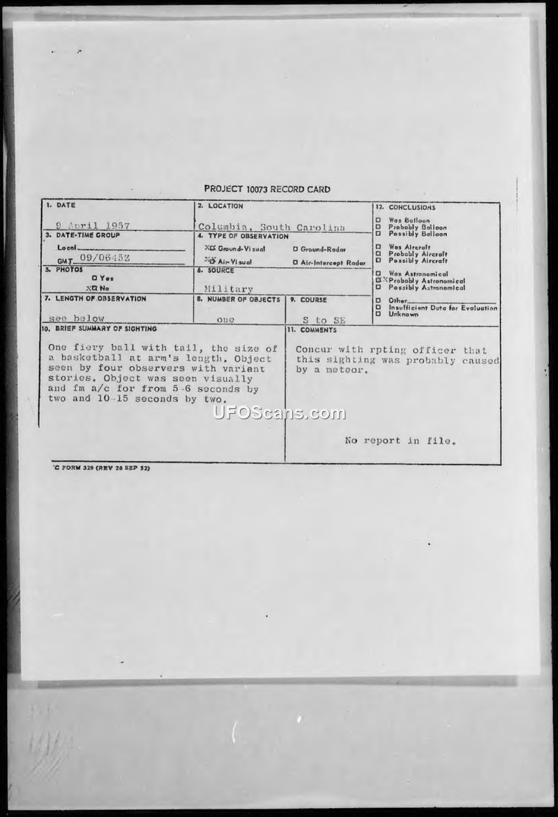 Project 10073 Record Card — Columbia, South Carolina, 9 April 1957