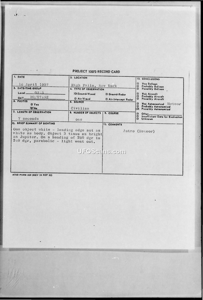 Project 10073 Record Card — High Falls, New York, 10 April 1957
