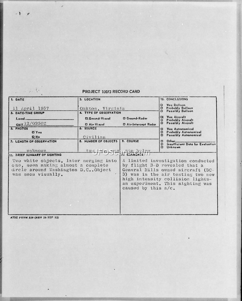 Project 10073 Record Card — Oakton, Virginia, 11 April 1957
