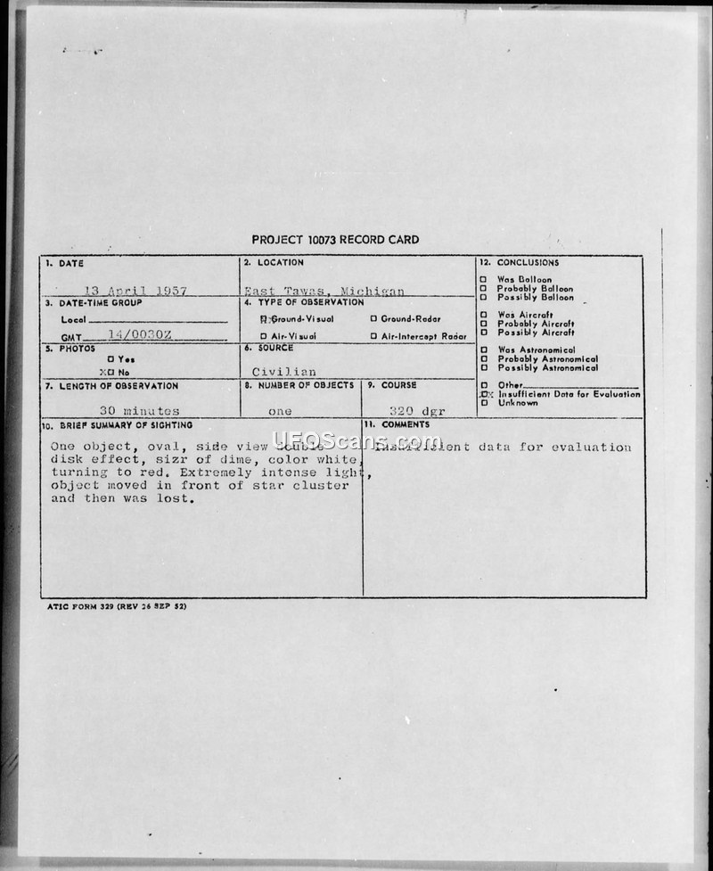 Project 10073 Record Card — East Tawas, Michigan, 13 April 1957