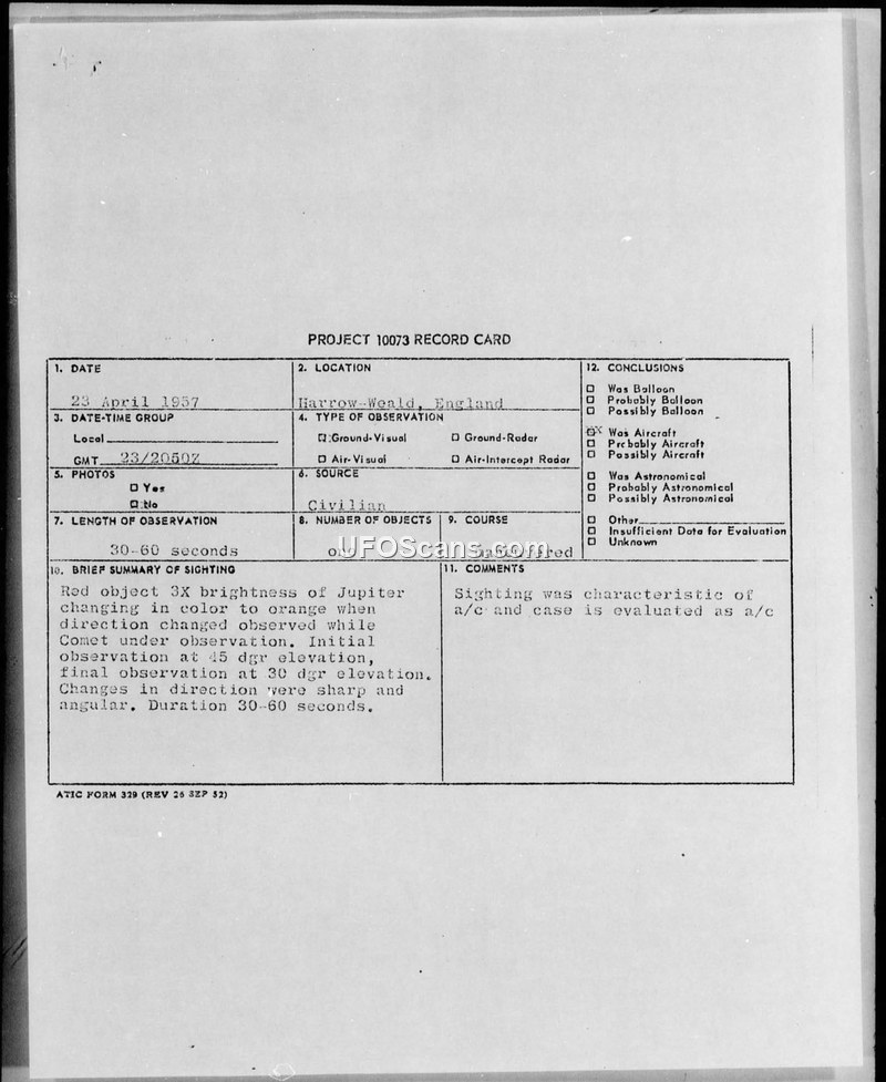 This document consists of a Project 10073 record card and subsequent military correspondence regarding a UFO sighting reported on April 23, 1957, in Harrow-Weald, England. The witnesses, a civilian woman and a C/Sgt from the 75th Air Base Group, observed a round, red object that appeared three times the size of Jupiter. The object reportedly traveled in a straight line before maneuvering at sharp 45-degree angles, during which it changed color to bright orange. The observation lasted between 30 and 60 seconds. The initial report from the field suggested the object was not an aircraft, citing the lack of sound and the absence of additional lights. However, the Air Technical Intelligence Center (ATIC) at Wright-Patterson Air Force Base rejected this conclusion. In a message dated April 30, 1957, ATIC stated that the description of maneuvers was characteristic of aircraft at high altitudes. The evaluating officer noted that it is a common difficulty for laymen to properly describe moving objects against the night sky and that aircraft, particularly jets, can often be observed at high altitudes without being heard, sometimes appearing to change color due to atmospheric conditions or exhaust flames. Further investigation confirmed that there were no USAF or RAF aircraft on the reported course or track within the London Control Zone at the time of the sighting, and no radar plots were identified. Despite the lack of specific aircraft identification, the official conclusion remained that the sighting was characteristic of an aircraft.