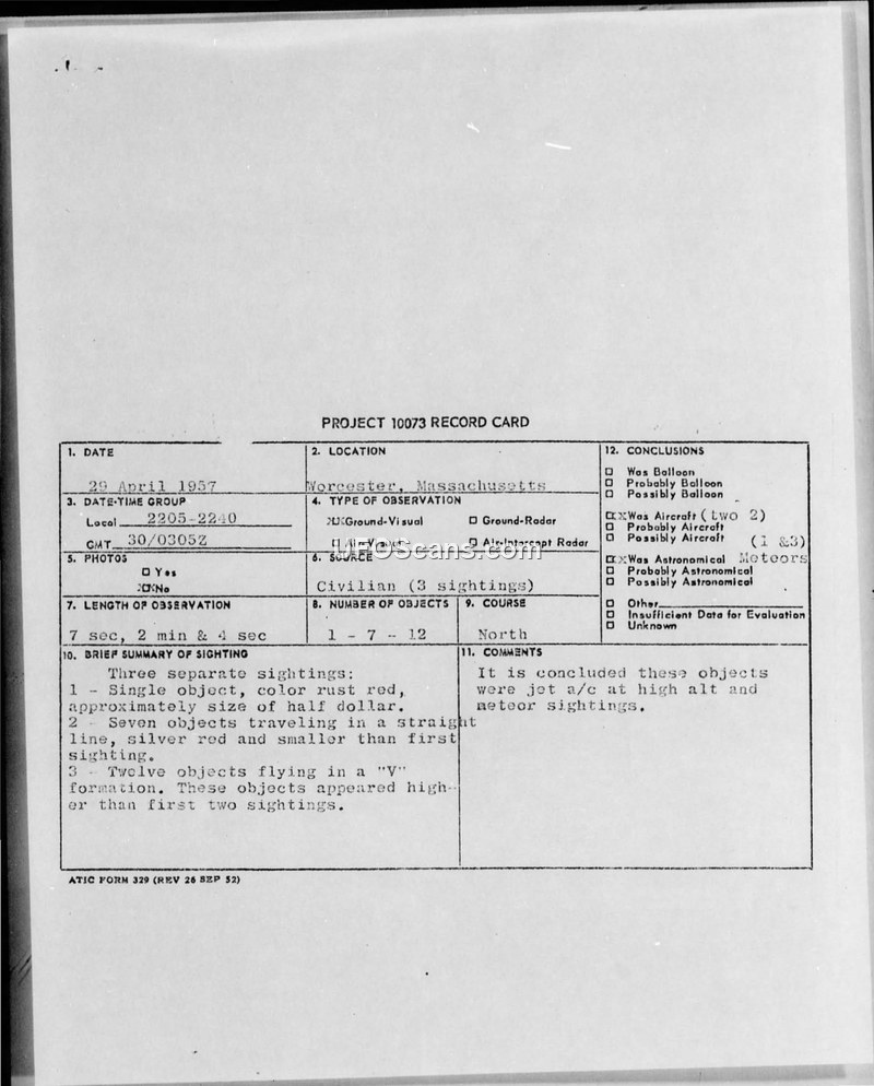 Project 10073 Record Card and Incident Report — Worcester, Massachusetts, 29 April 1957