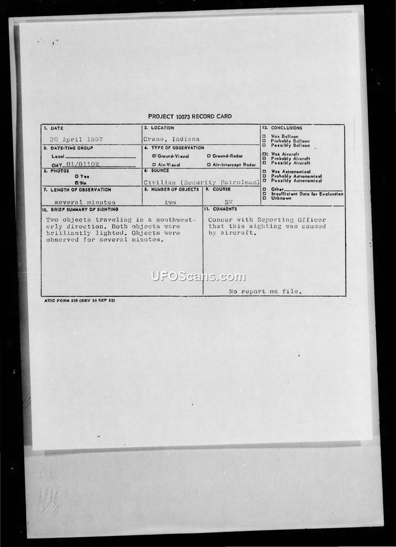 A civilian security patrolman in Crane, Indiana, reported two brilliantly lighted objects on April 30, 1957. The incident was officially attributed to aircraft by ATIC.