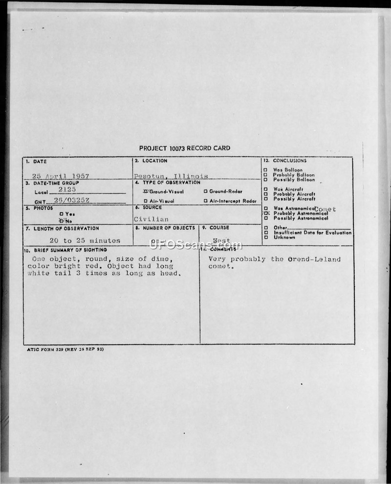 A 1957 sighting report from Pesotum, Illinois, describes a bright red, round object with a long tail. The military investigation concluded the object was likely the Orend-Leland comet.
