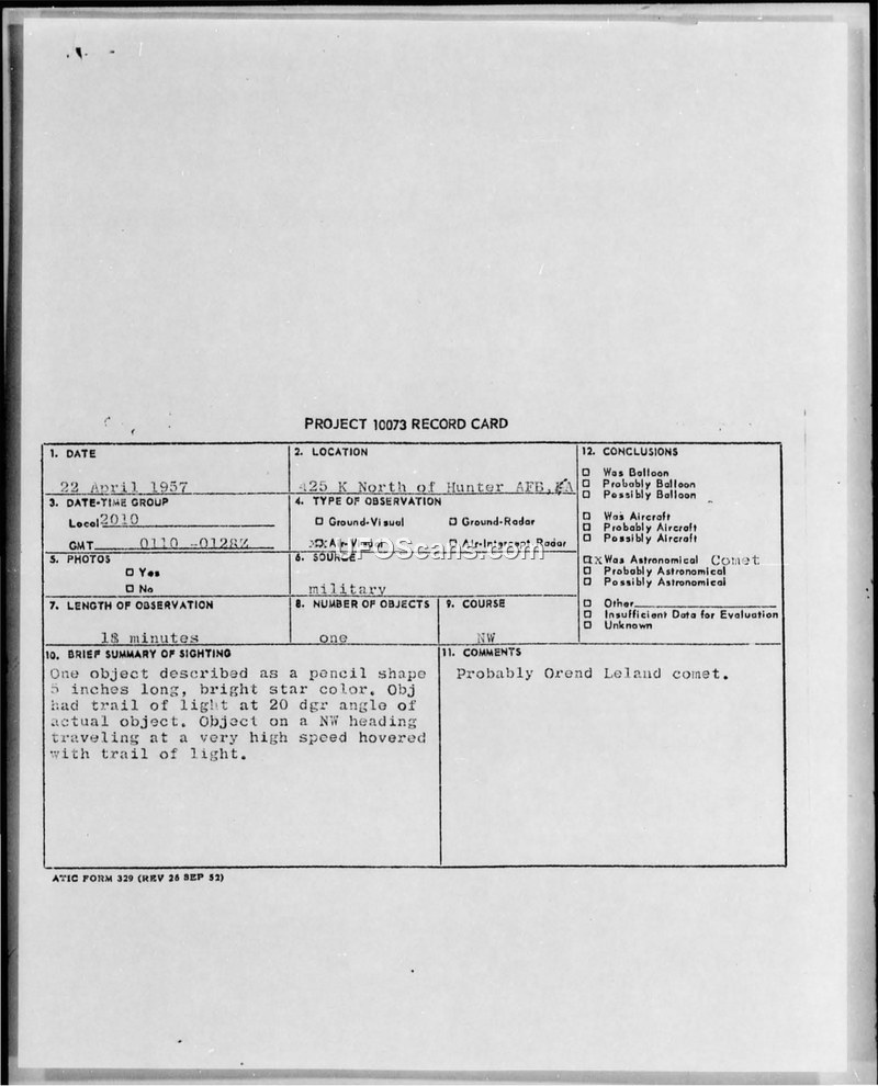 A pilot reported a pencil-shaped object with a trail of light near Hunter AFB on 22 April 1957. The incident was officially concluded to be the Orend-Leland comet.