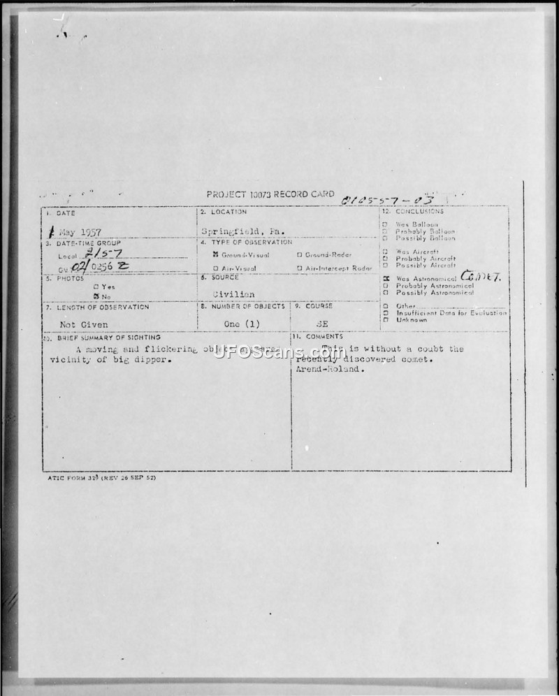 This document consists of a Project 10073 record card and associated military teletype correspondence regarding a UFO sighting reported in Springfield, Pennsylvania, in May 1957. A civilian witness reported observing a moving and flickering light in the vicinity of the Big Dipper. The report was processed through military channels, including the 4602nd Air Intelligence Squadron (AISS) and the Air Technical Intelligence Center (ATIC). The military investigation involved contacting the witness to obtain further details. Ultimately, the official conclusion reached by the investigating authorities was that the object was not an unidentified aerial phenomenon, but rather the recently discovered Arend-Roland comet. The documentation tracks the administrative flow of the report from the initial telephone call to the final identification.