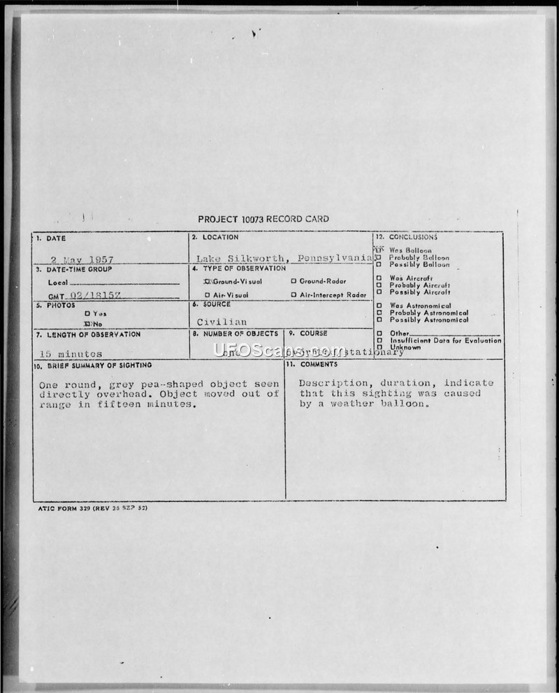 Project 10073 Record Card: Sighting at Lake Silkworth, Pennsylvania, 2 May 1957