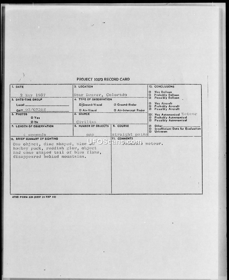 A technical motion picture writer reported a disc-shaped object with a blue flame tail near Denver on May 3, 1957. Military intelligence evaluated the sighting and concluded it was likely a meteor.