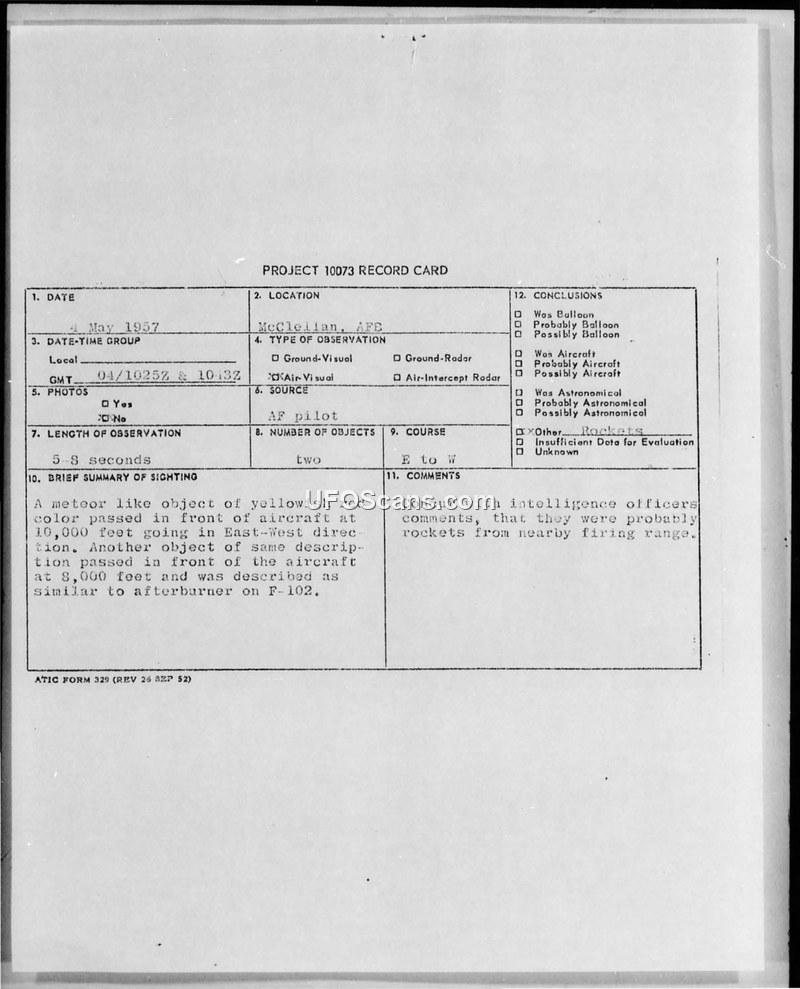 Project 10073 Record Card and Air Intelligence Information Report — 4 May 1957