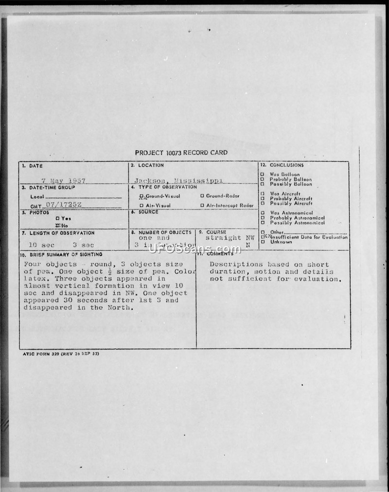 This document consists of a Project 10073 record card and associated military correspondence regarding an Unidentified Aerial Phenomena (UAP) sighting that occurred on 7 May 1957 in Jackson, Mississippi. The primary witness was Captain Lawrence Stage Jr., who reported observing four round, pea-sized objects. Three of these objects appeared in an almost vertical formation and moved in a straight path toward the northwest before disappearing after approximately 10 seconds. A fourth object appeared 30 seconds later and moved toward the north before disappearing after 3 seconds. The witness noted that the objects appeared to be above the highest cloud layer. The report explicitly states that there was no sound associated with the objects and that the sighting was not confirmed by radar. Meteorological conditions at the time were described as clear with some low stratus clouds in the southwest and unlimited visibility. The official conclusion reached by the evaluating authorities was that the information provided was insufficient for a formal evaluation due to the short duration of the observation and the lack of detailed motion data. The correspondence includes internal military communications between the 657th ACWRON in Houma, Louisiana, and various command centers, including the Air Technical Intelligence Center (ATIC) at Wright-Patterson Air Force Base, confirming the receipt and processing of the report in accordance with Air Force Regulation 200-2.
