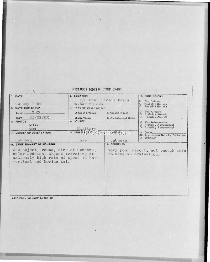 Project 10073 Record Card — Laredo, Texas, 20 May 1957