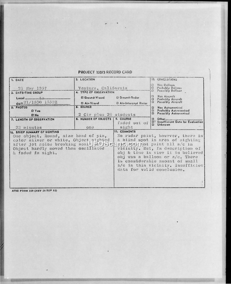 Project 10073 Record Card: Ventura, California Sighting, 21 May 1957