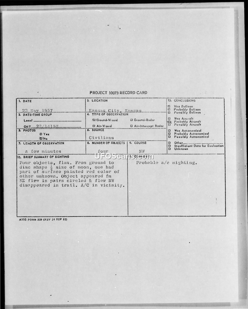 Project 10073 Record Card: Sighting in Kansas City, Kansas, 23 May 1957