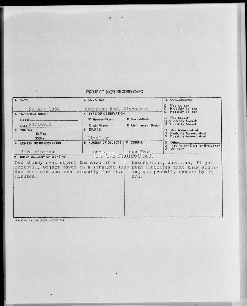 On 24 May 1957, at 1405Z, a civilian witness in Sturgeon Bay, Wisconsin, observed a single, shiny, oval-shaped object described as being the size of a football. The object was observed for a duration of five minutes, during which it traveled in a straight line due west. The weather conditions at the time were reported as clear and sunny, with visibility exceeding 15 miles. The sighting was documented on a Project 10073 record card and subsequently transmitted via teletype to the Air Technical Intelligence Center at Wright-Patterson Air Force Base, Ohio, and other military commands. The official conclusion reached by the evaluating authorities was that the sighting was likely caused by an aircraft. The report notes that the favorable weather conditions and the duration of the observation suggested that if the object's range had been small, identification would have been highly probable. The witness, identified as a Mrs. [illegible], was one of a party who observed the object, and it is suggested that one individual may have accidentally brought the object to the attention of the others.