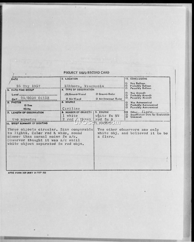 This document is a Project 10073 record card detailing a sighting that occurred on May 25, 1957, in Elkhorn, Wisconsin. The report describes an observation of three circular objects, which the witness initially mistook for aircraft due to their appearance and sound, which was noted as being dimmer than normal aircraft noise. The objects were described as having red and white colors. The flight path of the objects was recorded as white from the northwest and red from the south. The duration of the sighting was approximately two minutes. The witness reported that the white object eventually separated from the red objects. The record card notes that two other observers witnessed only the white object and believed it to be a flare. The official conclusion recorded on the card categorizes the sighting as a flare.