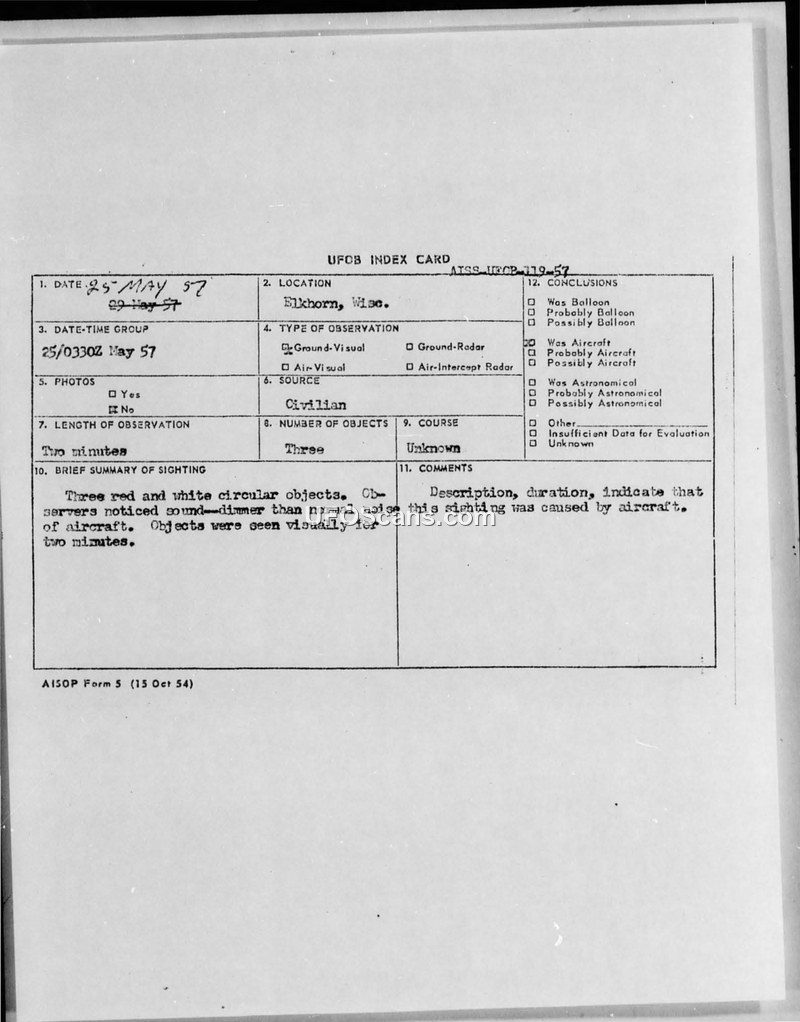A 1957 sighting of three circular, red and white objects near Elkhorn, Wisconsin, was officially attributed to aircraft by the 755th ACWRON. Despite reports of no air traffic in the area, investigators concluded the visual phenomena were consistent with aircraft maneuvers.