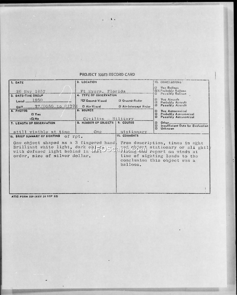 Project 10073 Record Card — Ft. Myers, Florida, 26 May 1957