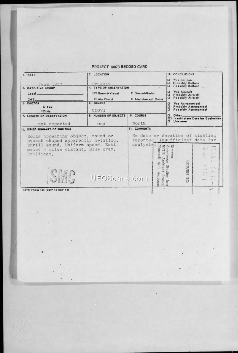 This document comprises a Project 10073 record card and an accompanying investigation report from the Uruguayan organization CIOVI (Centro de Investigación de Objetos Voladores Inidentificados). The report details a sighting in June 1957 by a 19-year-old female witness, identified as Sta. Martinez, in Campanero, Department of Lavalleja, Uruguay. The witness observed a single, solid, round, and squashed-shaped object that appeared metallic and blue-grey in color. The object was described as brilliant and moved at a uniform speed in a straight line from South to North. A notable feature of the sighting was the sound, which the witness described as a long, high-pitched whistle or 'chiflido'. The witness also reported that the glass windows of her house vibrated during the event. The investigation report contextualizes this sighting by comparing it to two other incidents: one in Canelones involving Sra. Amalia Lacondeguy de Lescoumes, who reported a high-frequency vibration, and another by Juan Ramón Mora, who described a sound similar to the humming of a bee. The CIOVI investigators concluded that the object was a 'flying saucer'. The record card itself notes that the duration of the sighting was not reported and that there was insufficient data for a definitive evaluation, though the accompanying narrative is more conclusive. The document includes a map of Uruguay and a detailed observation form filled out by the witness, which confirms the lack of radar contact and the absence of physical traces or physiological effects on the witness.