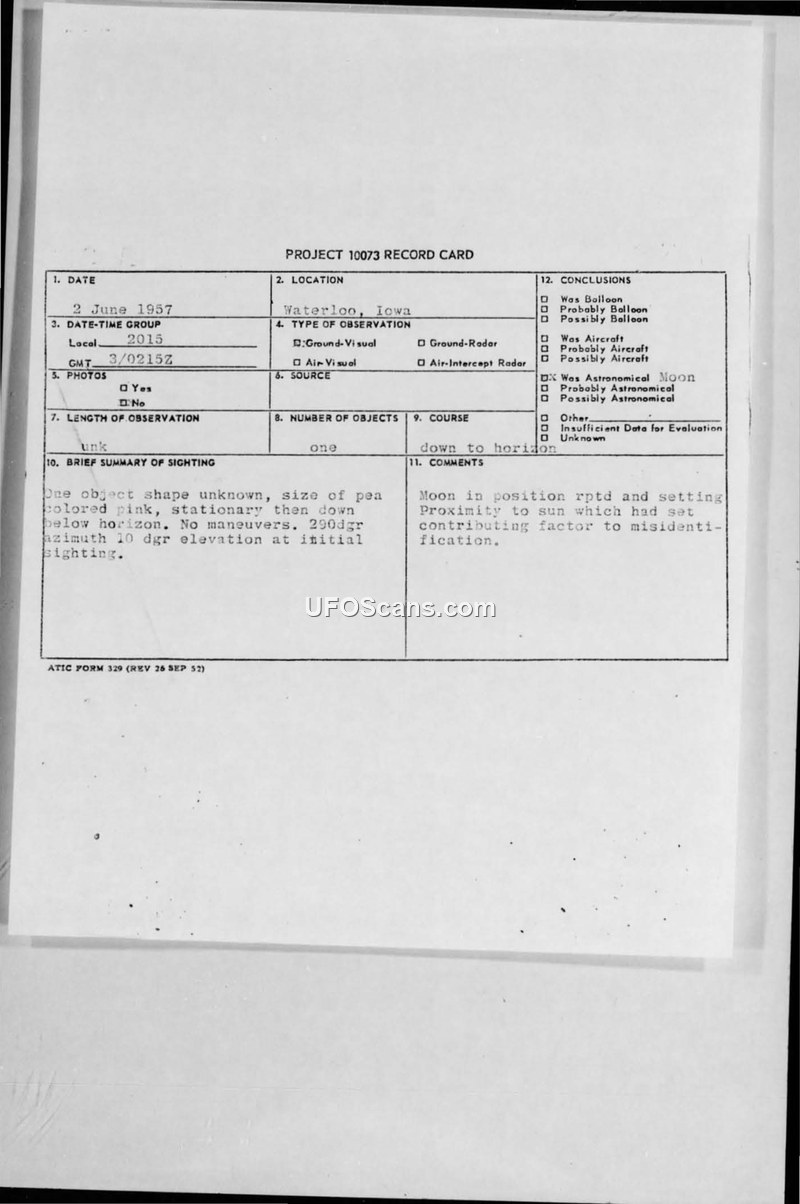 A June 1957 sighting of a pink, pea-sized object in Waterloo, Iowa, was officially identified by the Air Force as the moon. The report was filed under Project 10073 and noted that the setting moon's position relative to the sun caused the misidentification.