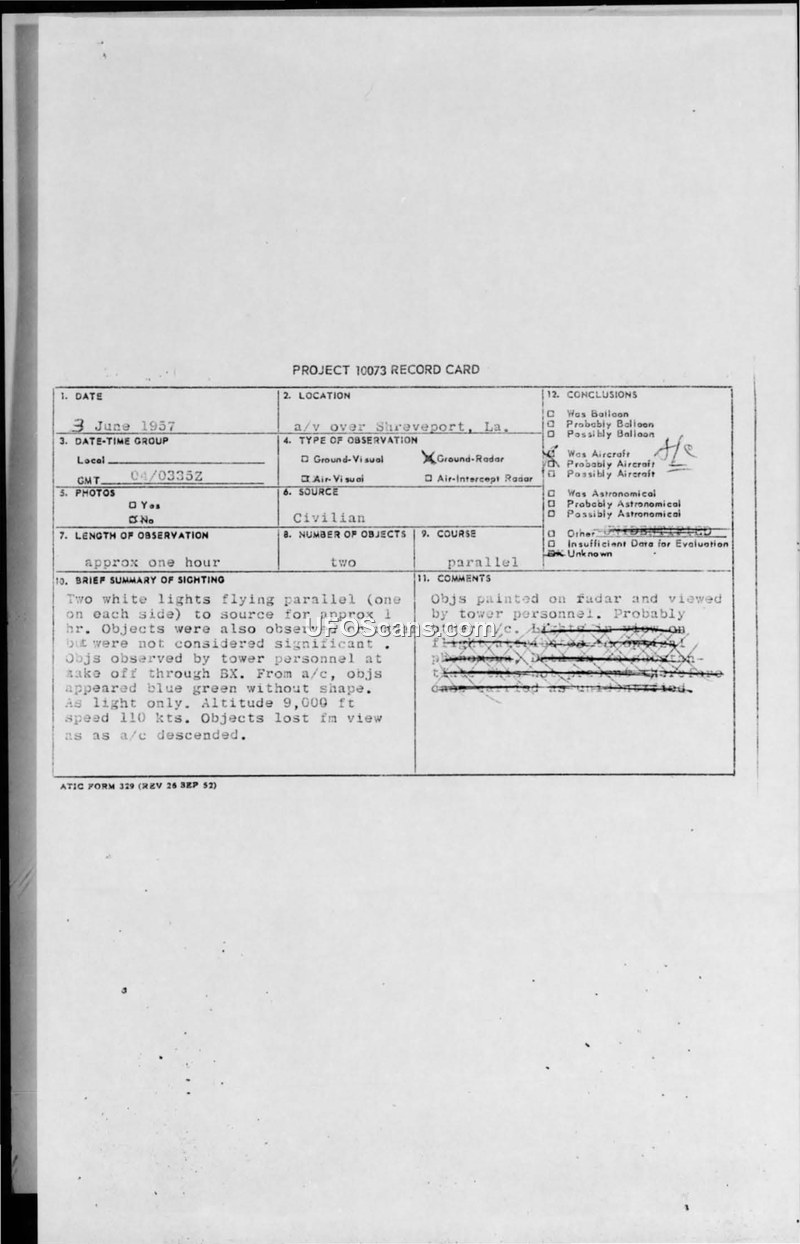 A Trans-Texas Airlines flight crew reported two unidentified objects with blue-green lights near Shreveport, Louisiana, on June 3, 1957. The Air Force investigation concluded the objects were likely B-47 aircraft conducting refueling operations.