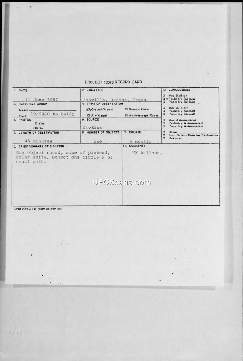 Project 10073 Record Card and Sighting Report — Amarillo/Odessa, Texas, June 1957