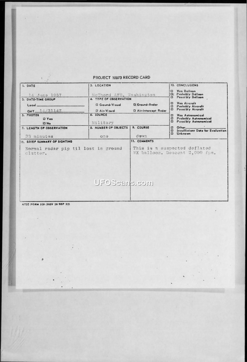 Project 10073 Record Card — McChord AFB, Washington, 14 June 1957