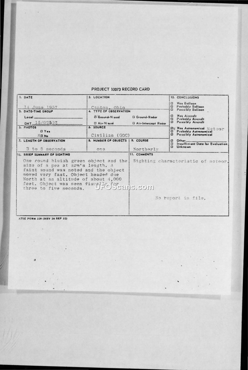 A Project 10073 record card detailing a June 1957 sighting in Canton, Ohio, of a fast-moving, bluish-green object. The event was officially classified as a meteor.