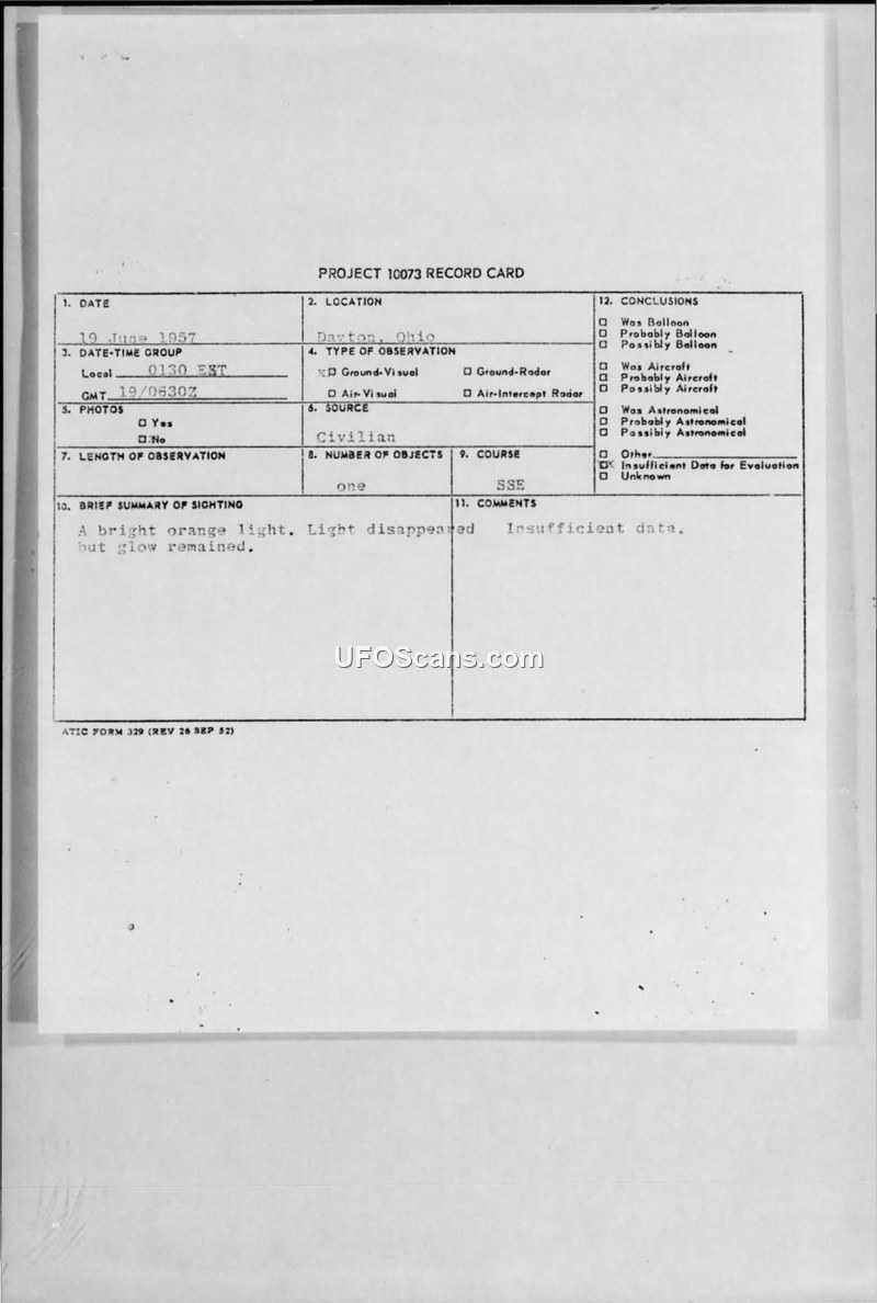 A civilian reported a bright orange light in Dayton, Ohio, on 19 June 1957. Military investigators were unable to obtain further details or witness information, resulting in a conclusion of insufficient data.