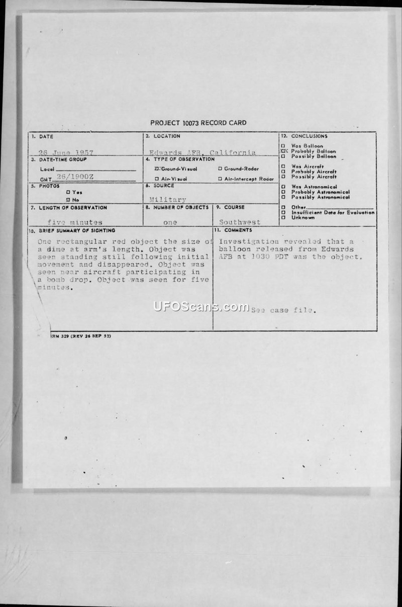 A June 1957 UFO sighting by Air Police at Edwards AFB was investigated and officially attributed to a 3-foot radiosonde weather balloon. The investigation revealed that the initial report was filed without consulting the personnel conducting the concurrent bomb drop mission.