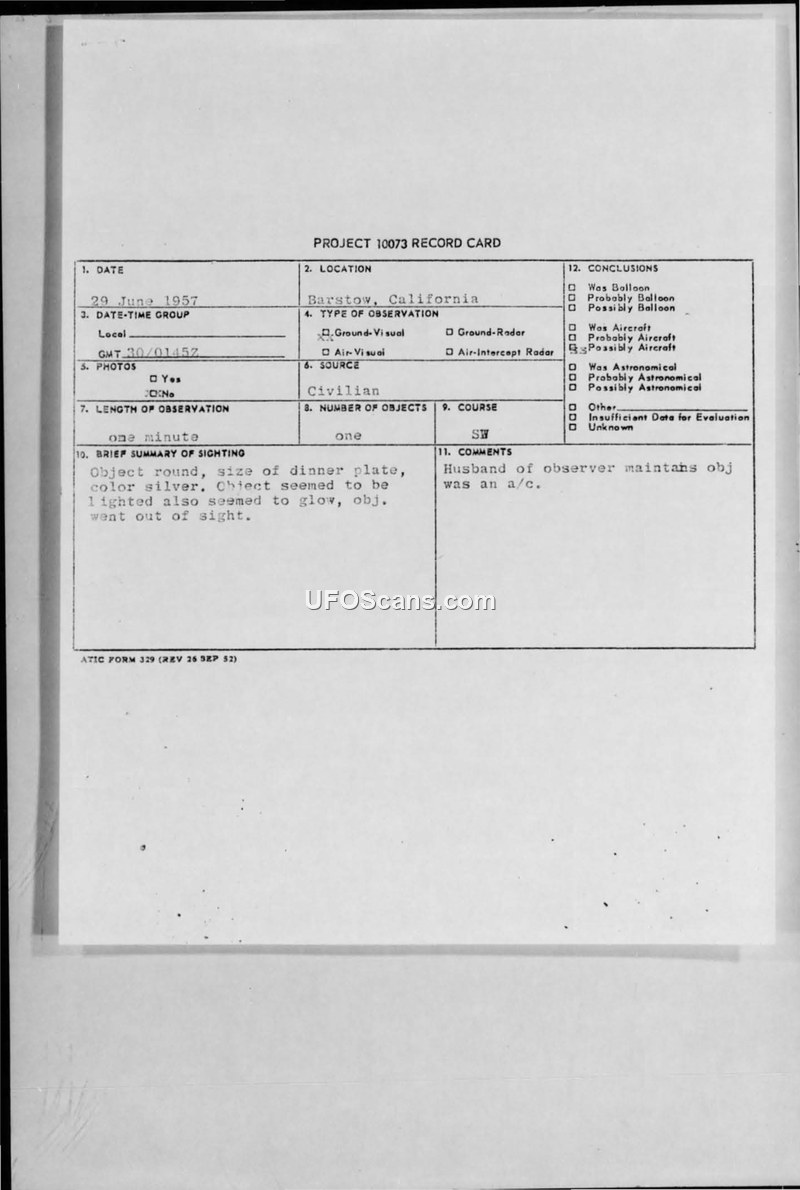 Project 10073 Record Card — Barstow, California, 29 June 1957