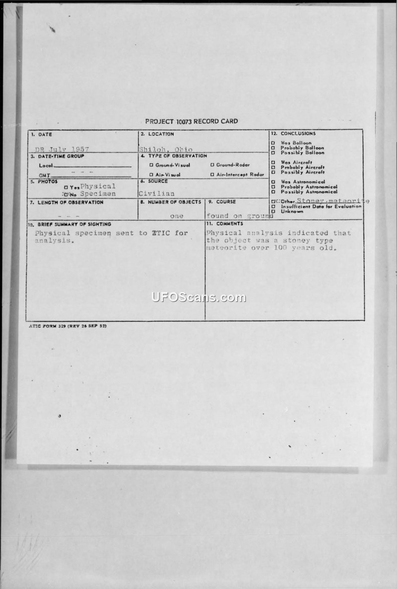 A stone found in Shiloh, Ohio, was submitted to the Air Force for analysis as a suspected meteorite. Scientific examination concluded it was a sedimentary rock of no intelligence value, and the object was returned to the owner.