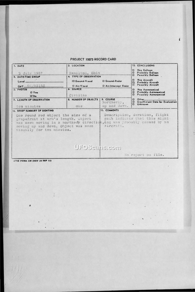 This document consists of a Project 10073 record card and associated teletype communications regarding unidentified aerial phenomena. The primary record card documents a sighting in Hamilton, Ohio, on July 3, 1957, at 040215Z. The witness reported a single, round, red object, approximately the size of a grapefruit at arm's length, moving in a northerly direction and oscillating vertically for ten minutes. The official conclusion for this incident suggests it was likely an aircraft. The document also includes a teletype report originating from the 25th CADD at McChord AFB, Washington, detailing a separate sighting by a 25-year-old woman in Seattle. This witness described a cylindrical, orange object with two smaller parallel lights that blinked infrequently. She observed the object for five hours while looking for sparklers near her home, noting its slow movement and an elevation of 13 degrees. The teletype also references a separate, unrelated incident involving a sheriff who investigated a report of a light and heard voices near a lake. The documentation reflects the standard military procedure for reporting and evaluating UAP sightings during the 1950s, involving coordination between various Air Force and CONAD units.