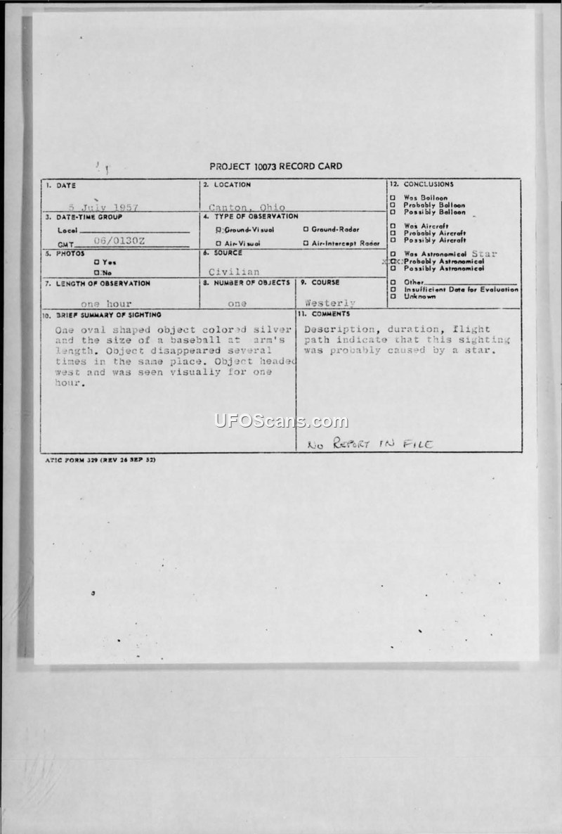 A 1957 sighting report from Canton, Ohio, describes a silver, oval object observed for one hour. The official investigation concluded the object was likely a star.