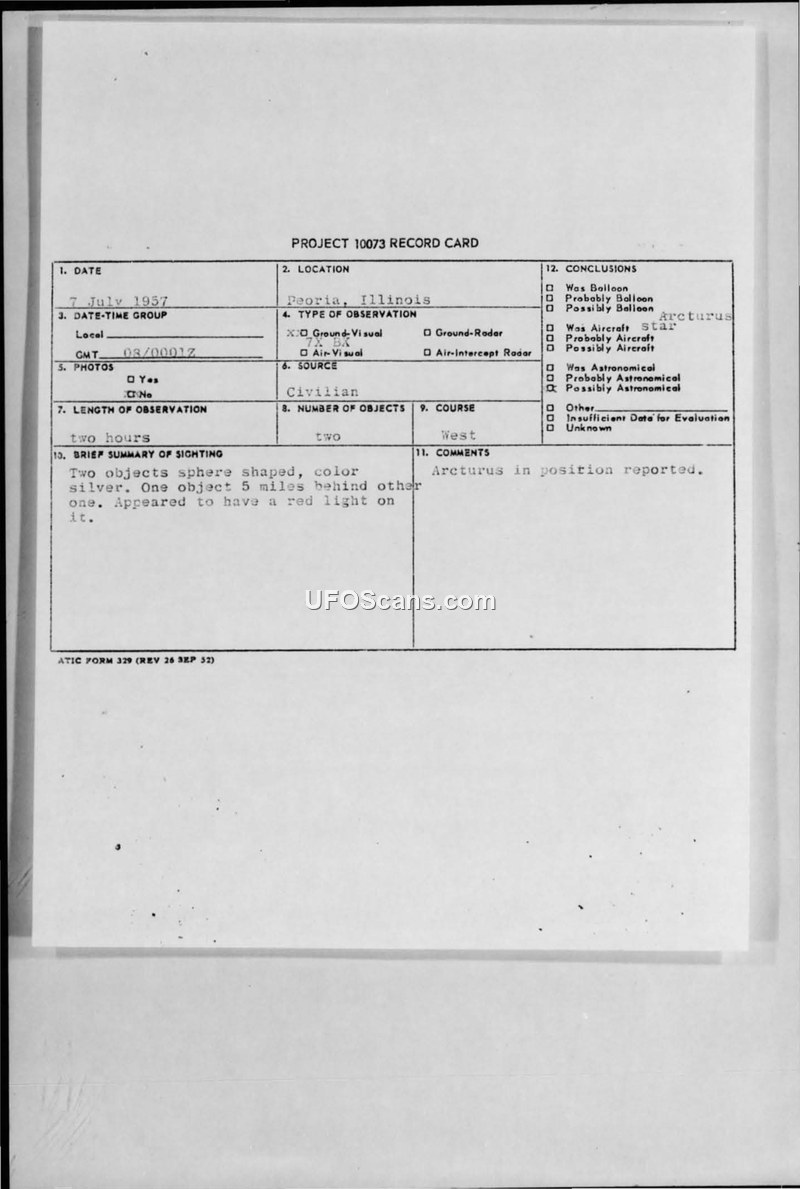 A civilian in Peoria, Illinois, reported two silver, sphere-shaped objects on July 7, 1957. Military authorities investigated the report and concluded the sighting was an observation of the star Arcturus.