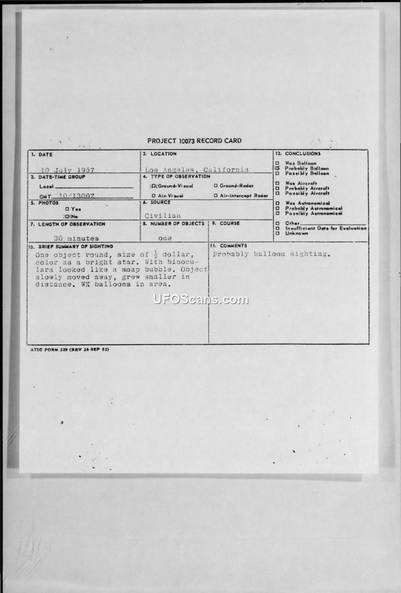 A series of UFO sightings in Los Angeles in July 1957 were investigated by the 1006th AISS. The military concluded the objects were likely gas-filled balloons with flares attached, released by pranksters.