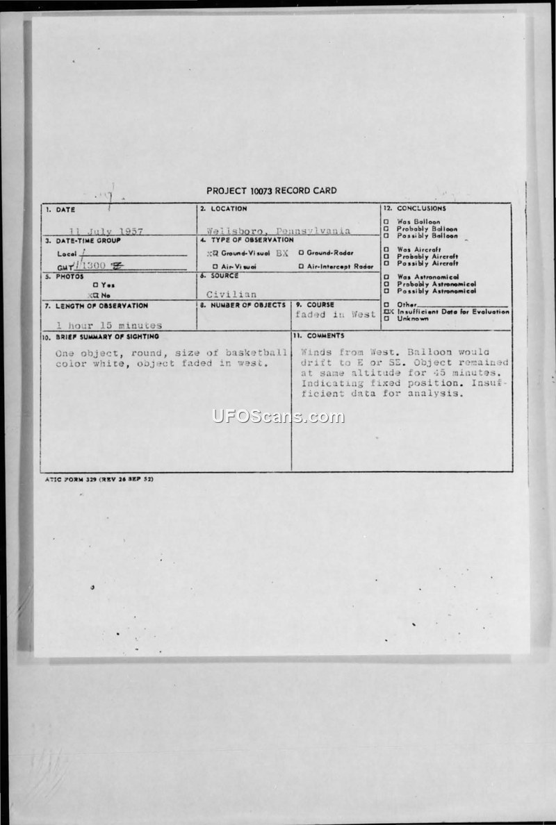A round, white object the size of a basketball was observed over Wellsboro, Pennsylvania, on July 11, 1957. Military authorities concluded there was insufficient data for analysis, though it was noted it could have been a weather balloon.