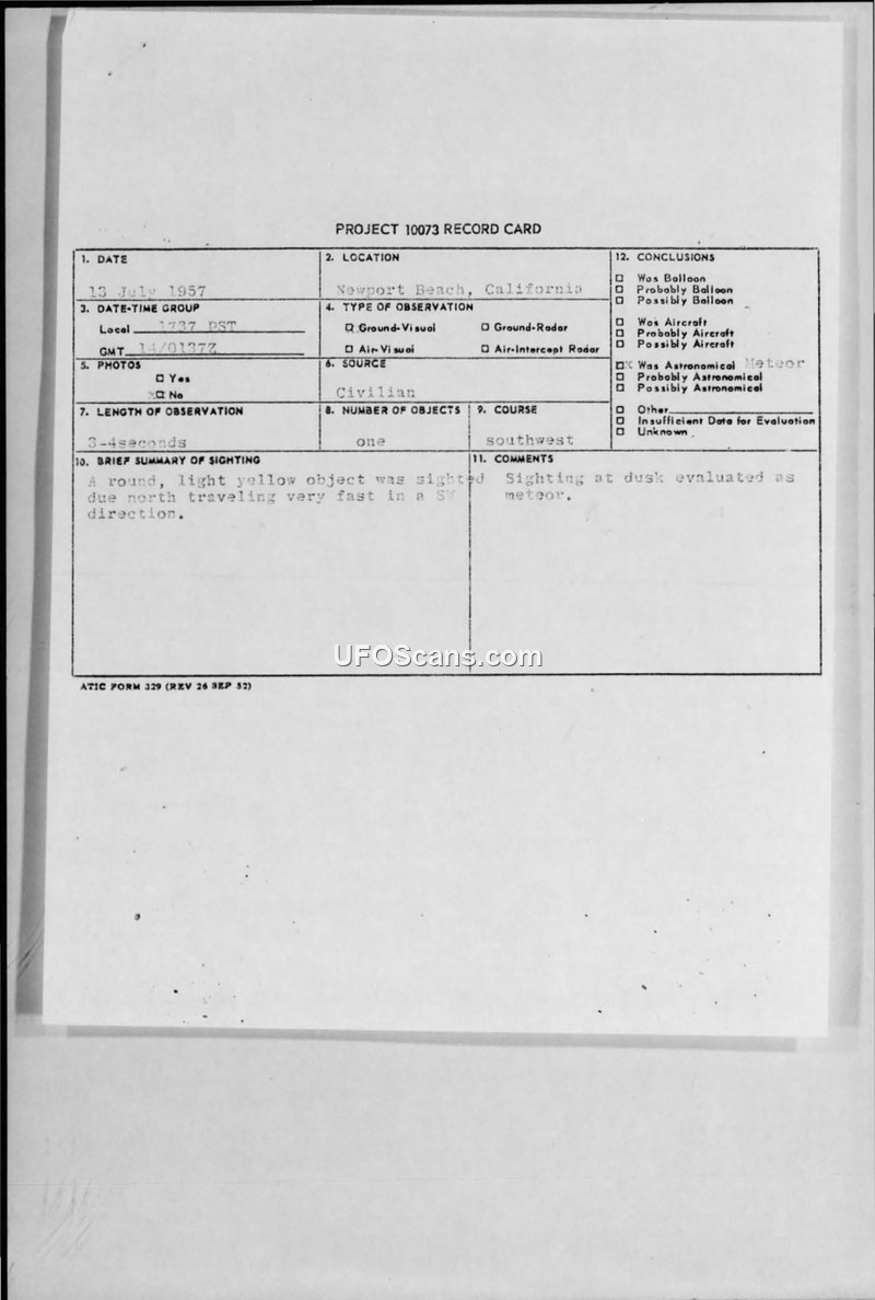 A civilian sighting of a round, light-yellow object in Newport Beach, California, on July 14, 1957, was initially classified as a meteor. Subsequent investigation concluded the sighting was likely a specular reflection caused by the sun's position while observing aircraft.