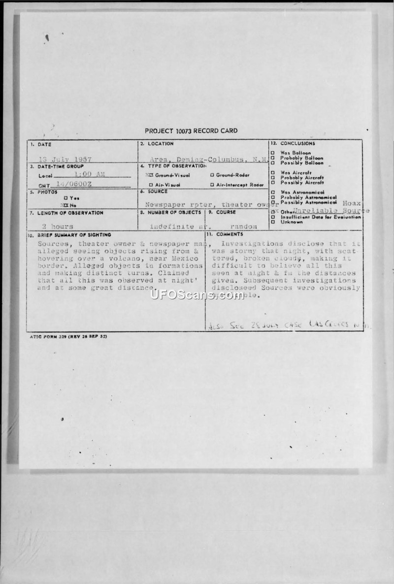 Project 10073 Record Card: Deming-Columbus-Las Cruces UFO Case, 14 July 1957