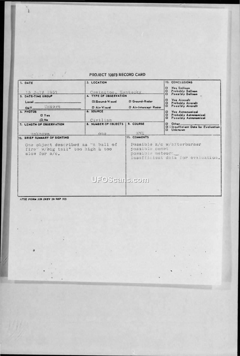 A civilian in Covington, Kentucky, reported a 'ball of fire' with a 'big tail' on 15 July 1957. Military investigators concluded there was insufficient data to identify the object, though they considered meteors or aircraft as potential explanations.