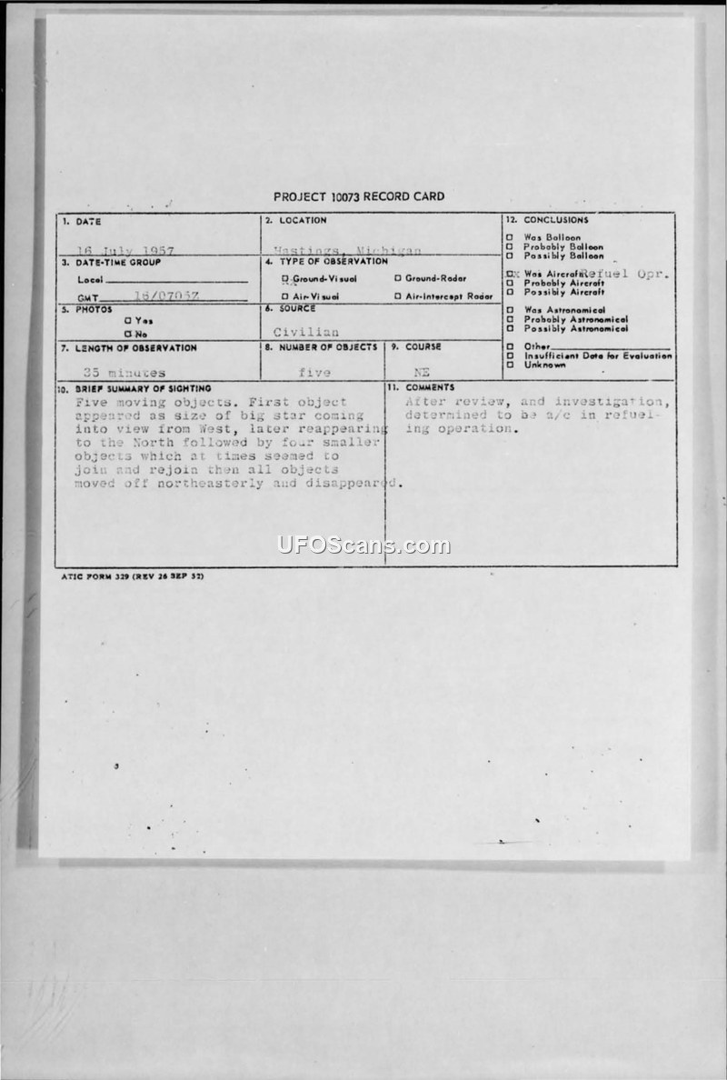 Project 10073 Record Card and Air Intelligence Information Report — Hastings, Michigan, July 16, 1957