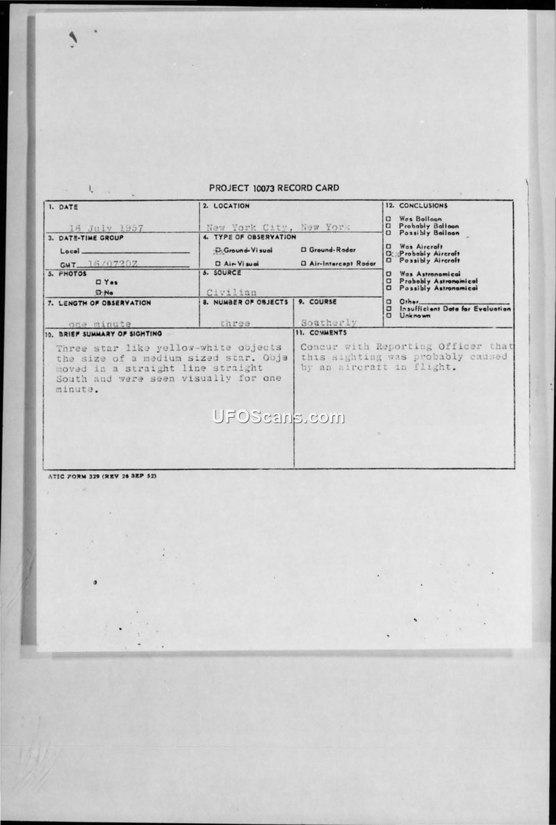 A 1957 sighting report from New York City involving three star-like objects moving south. The official conclusion attributed the sighting to an aircraft in flight.