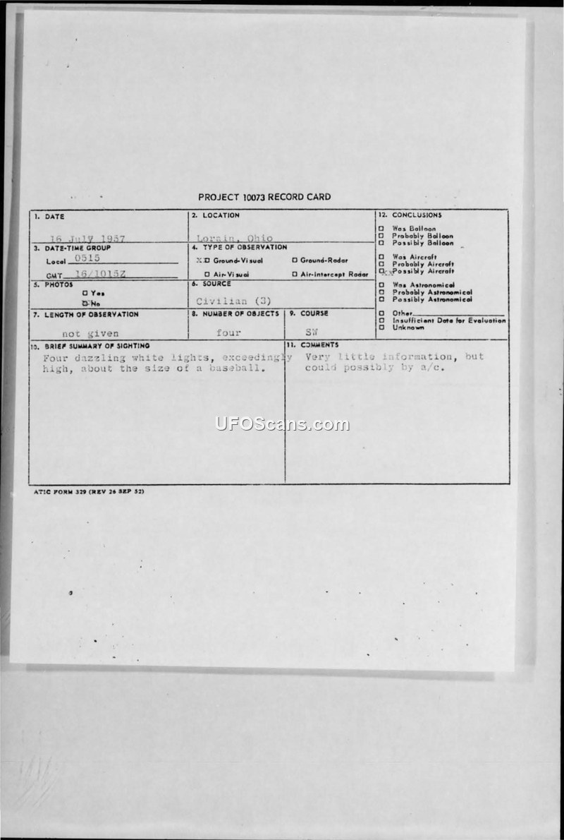 Project 10073 Record Card — Lorain, Ohio, 16 July 1957