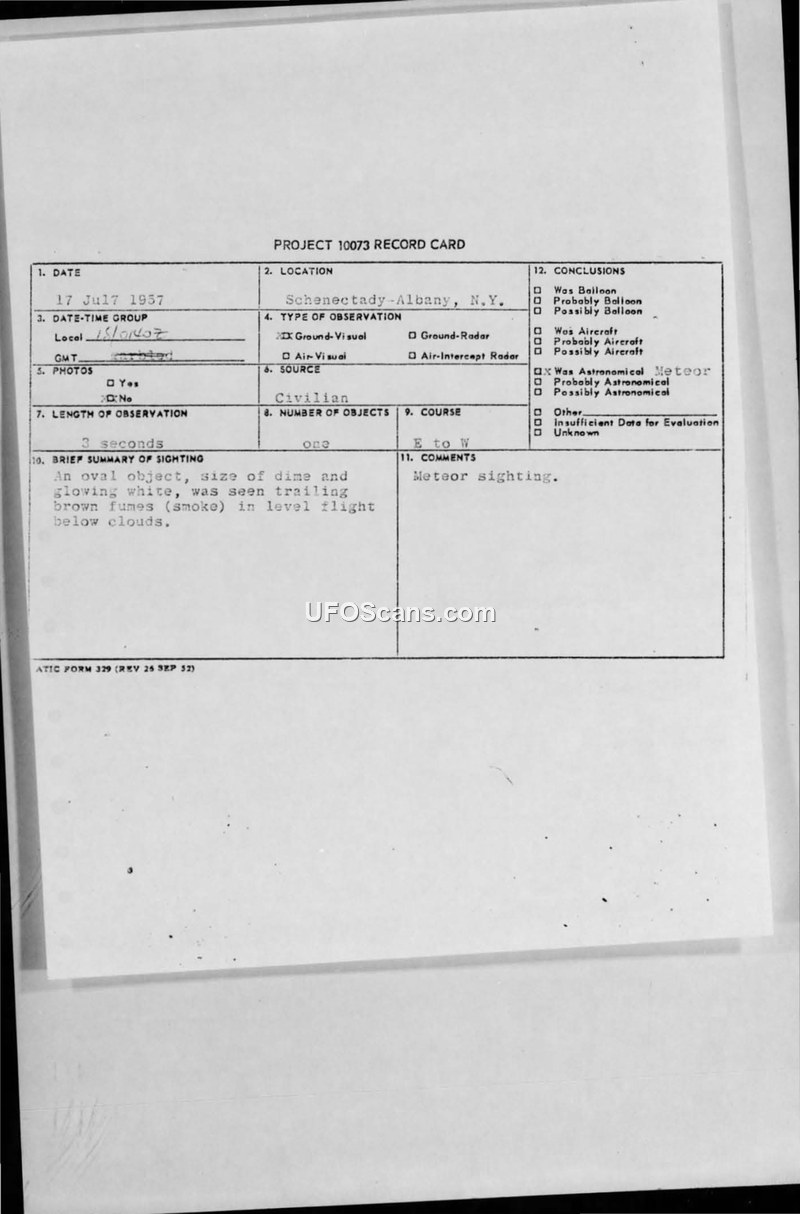 Project 10073 Record Card — Schenectady-Albany, N.Y., 17 July 1957