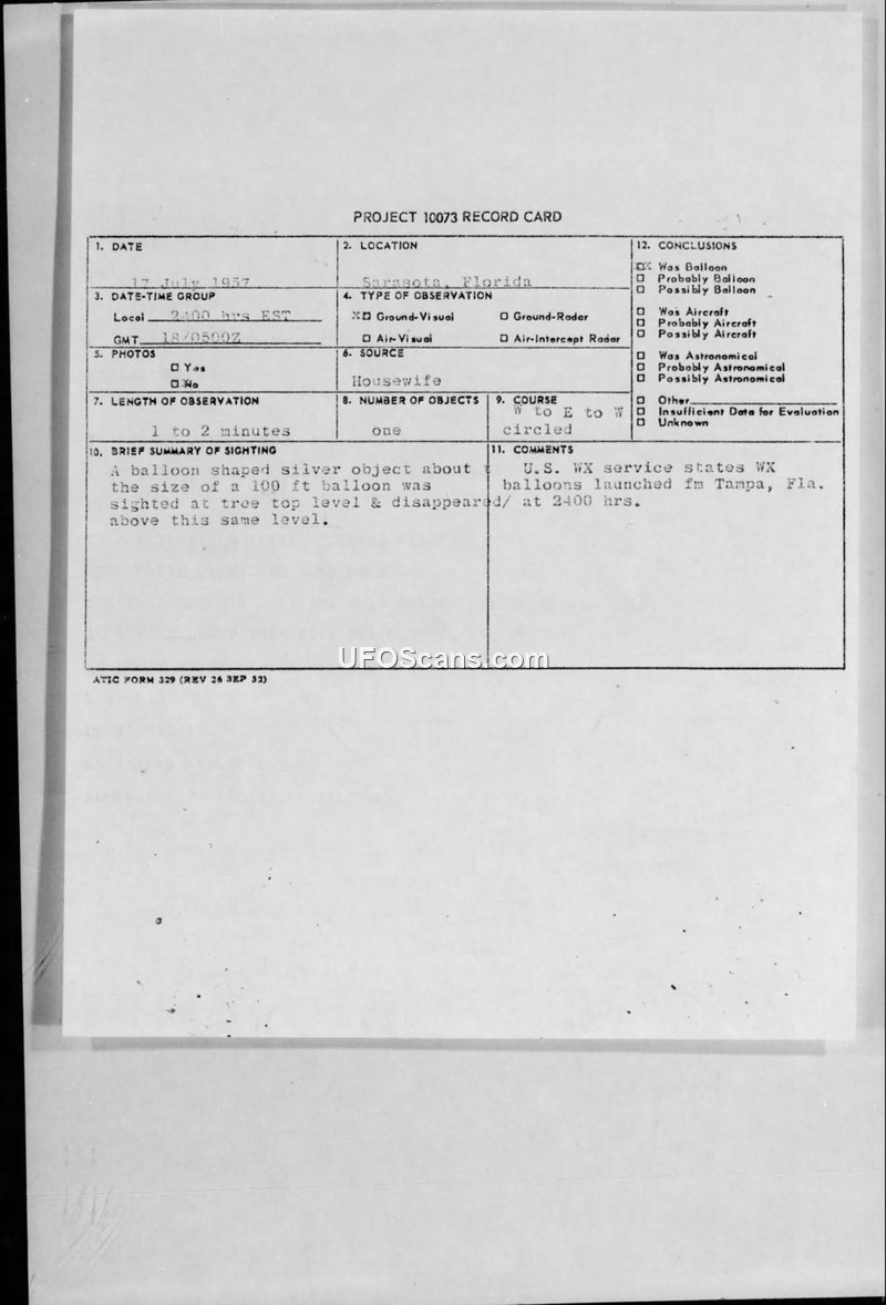 Project 10073 Record Card — Sighting near Sarasota, Florida, July 1957