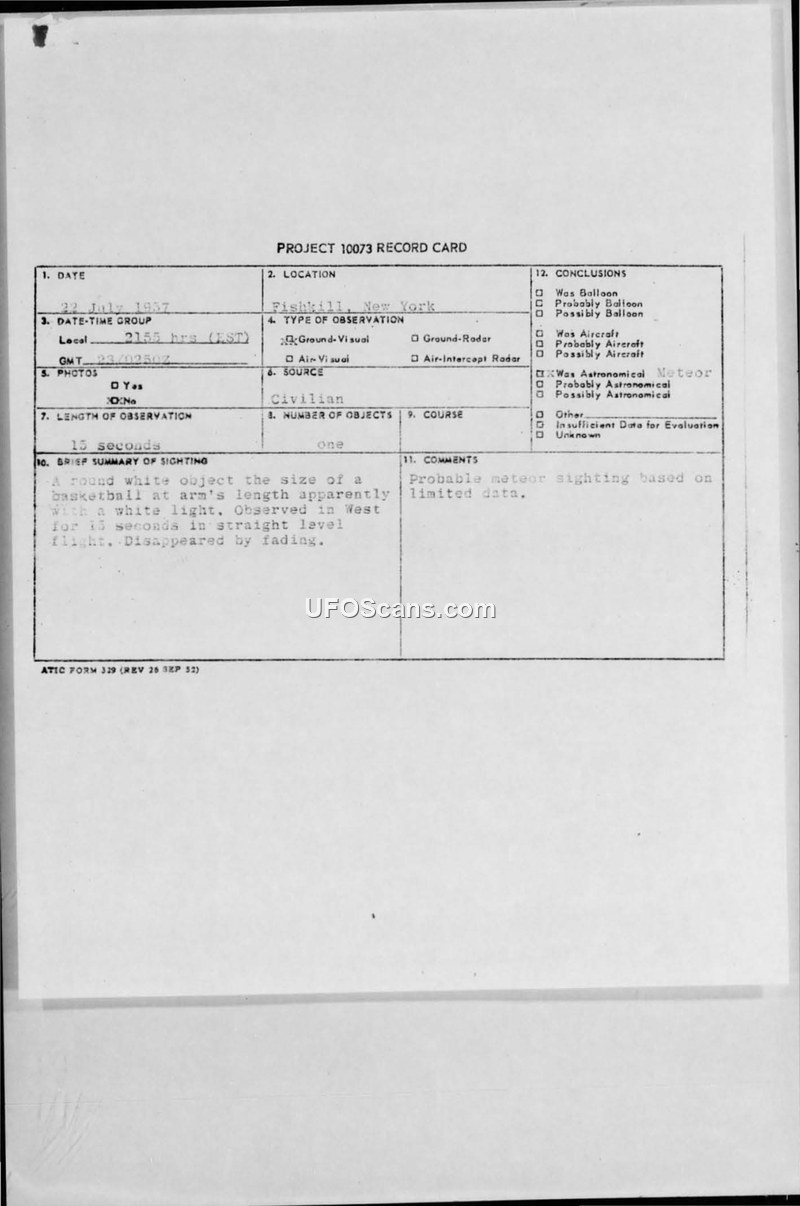 A civilian in Fishkill, NY, reported a round, white, basketball-sized object in the sky on July 22, 1957. The Air Technical Intelligence Center concluded the sighting was likely a meteor.