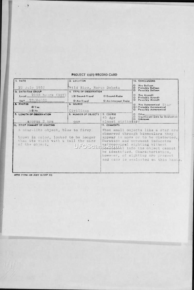 A civilian couple in Wild Rice, North Dakota, reported a stationary, star-like object with a tail on July 22, 1957. Investigators concluded the sighting was likely an astronomical phenomenon distorted by binocular observation, resulting in an insufficient data classification.