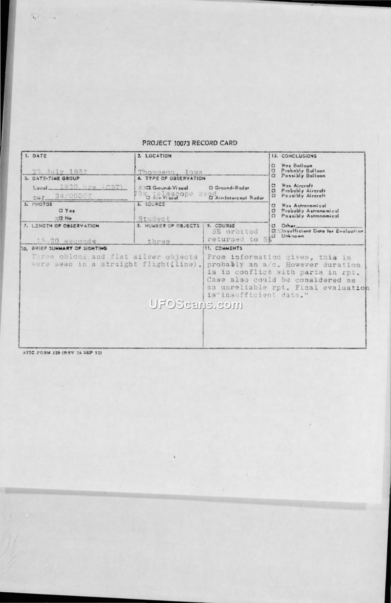 Project 10073 Record Card — Thompson, Iowa, 23 July 1957