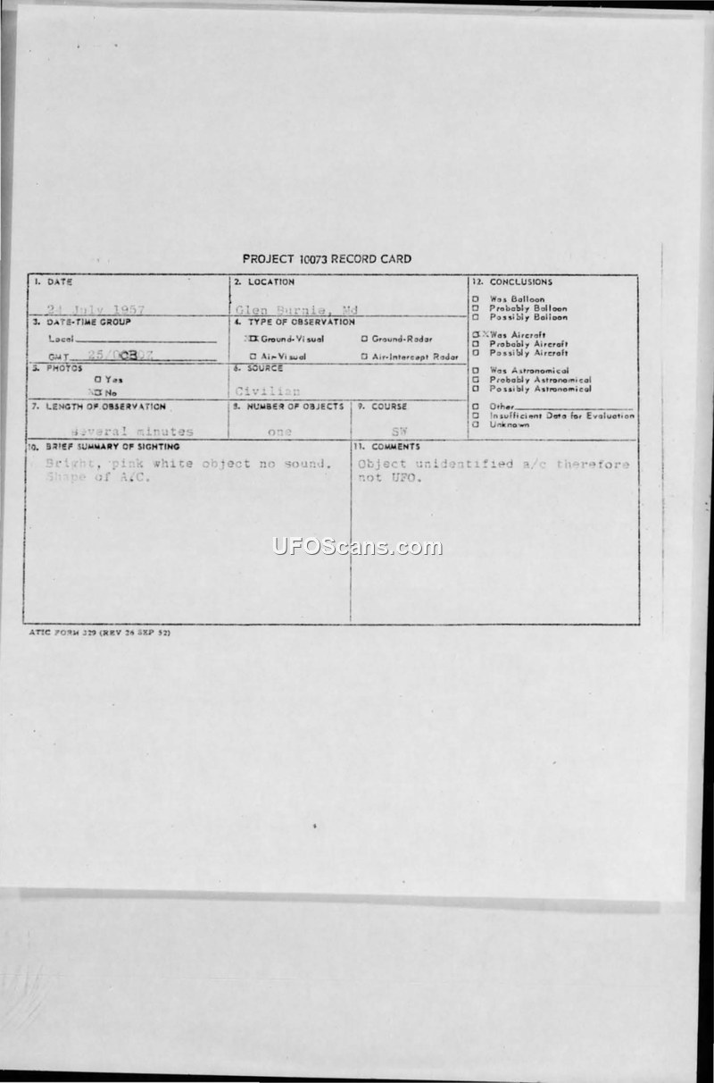 Project 10073 Record Card and Air Intelligence Information Report — Glen Burnie, Maryland, 25 July 1957