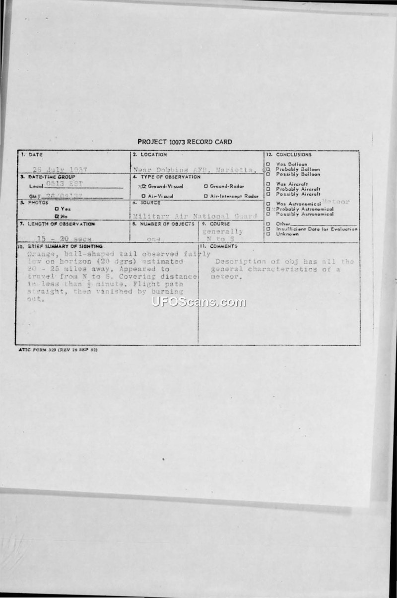 Project 10073 Record Card — Sighting near Dobbins AFB, 26 July 1957